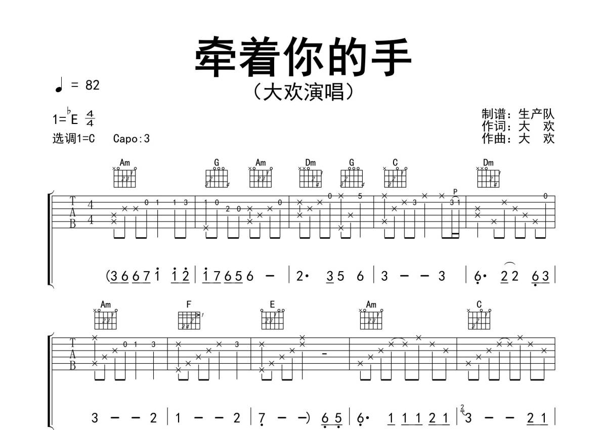 《牵着你的手》是大欢演唱的一首歌曲,精编完美版,拍号为4/4拍,歌曲速度为每分钟82拍,歌曲原调为Eb调,但由于原调指法比较难,为了方便弹奏,本吉他谱采用的是C调指法编配,变调夹3品弹奏即为原调,当然也可以根据自己的音域改变变调夹位置,或者通过改变和弦调性,以方便自己弹奏,这份吉他谱共有三张高清图谱,图谱由 @生产队 编配上传,图谱使用六线谱编配,包含吉他和弦指法、简谱以及歌词部分,使用这份牵着你的手吉他谱,可以让你更加方便地掌握这首歌曲的弹唱技巧,快来尝试吧。《牵着你的手》是由大欢创作并演唱的歌曲。本吉他谱根据C调指法编配,完整的前奏、间奏、尾奏和solo编配,精编完美版,值得推荐的一首民谣歌曲。牵着你的手一直到白头,一起走在家的老路口,多年以后就这样牵着你的手,直到我们人生的尽头。
