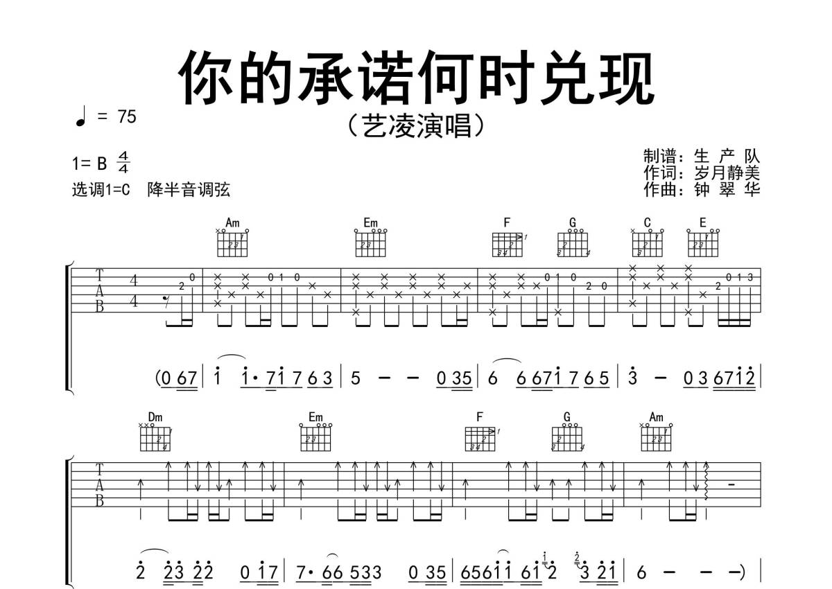 《你的承诺何时兑现》是艺凌演唱的一首歌曲,精编完美版,拍号为4/4拍,歌曲速度为每分钟75拍,歌曲原调为B调,但由于原调指法比较难,为了方便弹奏,本吉他谱采用的是C调指法编配,降半音调弦弹奏即为原调,当然也可以根据自己的音域决定是否调弦,这份吉他谱共有三张高清图谱,图谱由 @生产队 编配上传,图谱使用六线谱编配,包含吉他和弦指法、简谱以及歌词部分,使用这份你的承诺何时兑现吉他谱,可以让你更加方便地掌握这首歌曲的弹唱技巧,快来尝试吧。《你的承诺何时兑现》是由歌手艺凌演唱的歌曲。本吉他谱根据原版C调指法编配,完整的前奏、间奏、尾奏和solo编配,精编完美版,值得推荐的一首抒情歌曲。和你在一起这么长时间,你的承诺何时能兑现,我想要的结果你总是躲闪,让我在等待中备受熬煎。