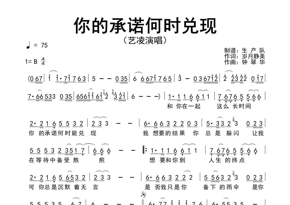 《你的承诺何时兑现》是艺凌演唱的一首歌曲,原版简谱,拍号为4/4拍,歌曲速度为每分钟75拍,这份简谱共有一张高清图谱,图谱由 @生产队 编配上传艺凌演唱的歌曲《你的承诺何时兑现》原版简谱,完整的前奏、间奏、尾奏和solo编配。