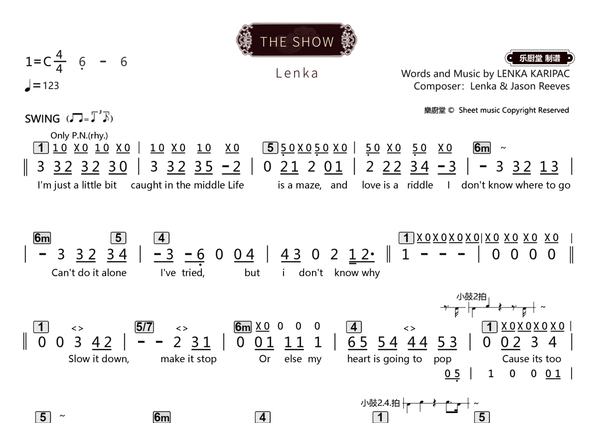 《The Show》是Lenka演唱的一首歌曲,拍号为4/4拍,这份乐队总谱共有三张高清图谱,图谱由 @乐厨堂 编配上传。