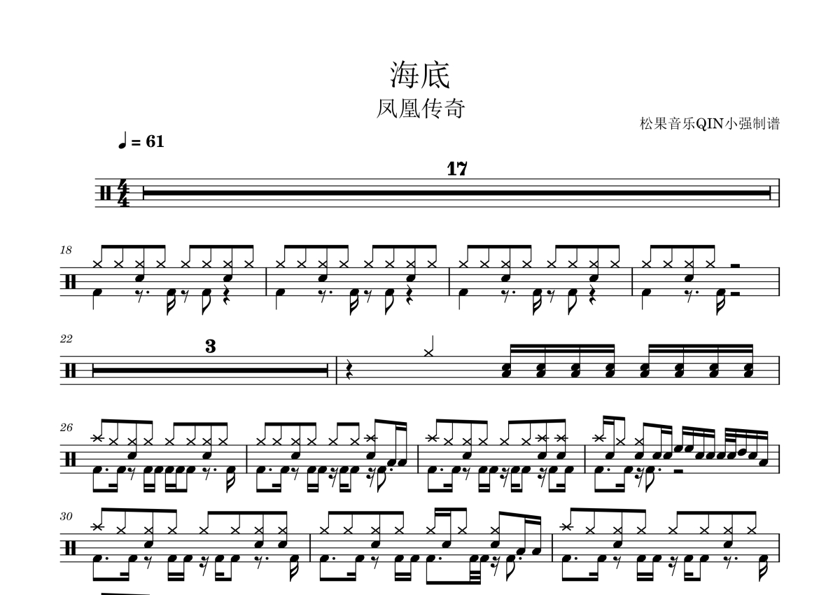 《海底》是凤凰传奇演唱的一首歌曲,拍号为4/4拍,这份架子鼓谱共有两张高清图谱,图谱由 @松果音乐QIN小强 编配上传,图谱使用五线谱编配,使用这份海底架子鼓谱,你将能够轻松地敲打出这首凤凰传奇的海底,快来尝试吧。凤凰传奇海底。
