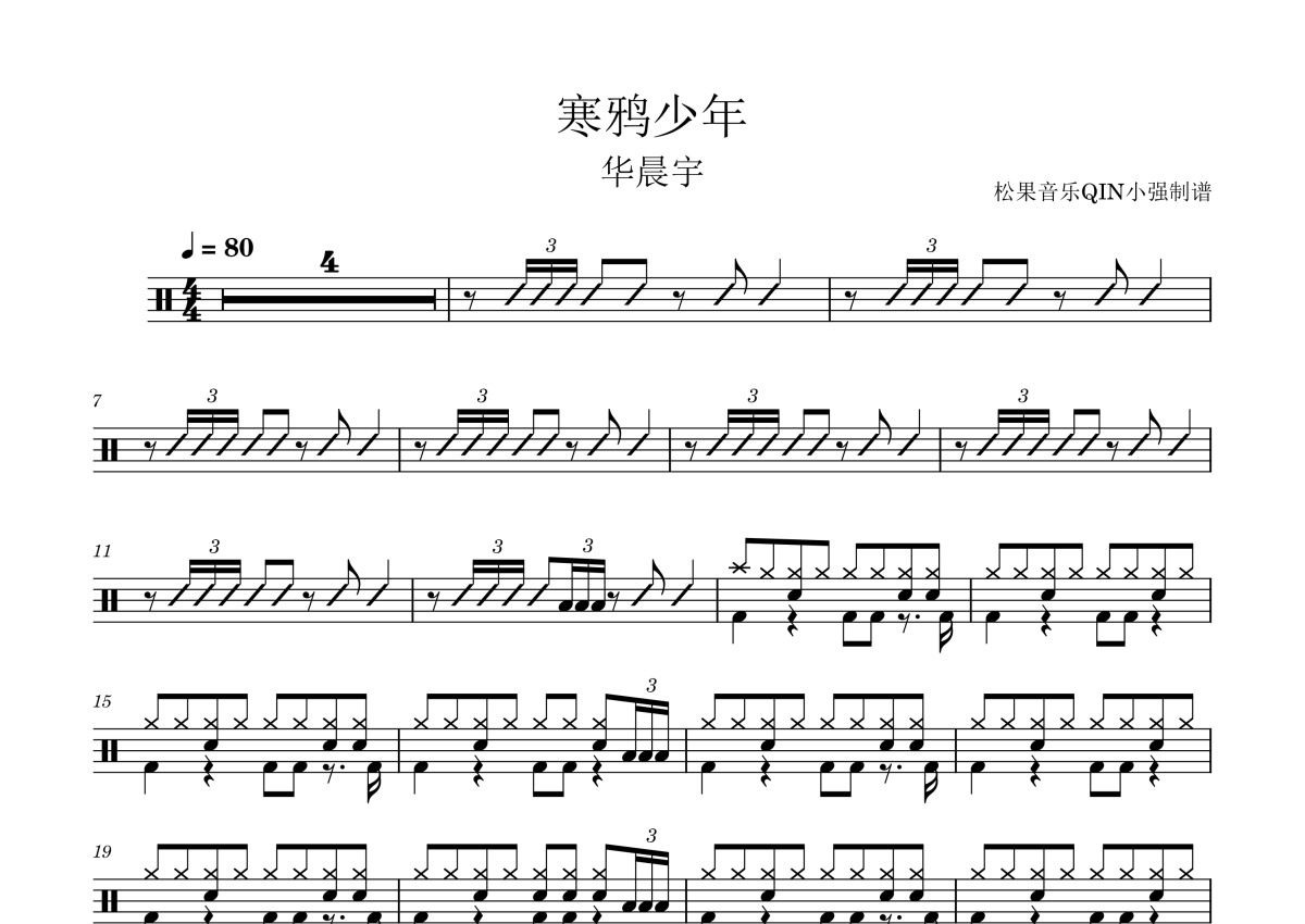 《寒鸦少年》是华晨宇演唱的一首歌曲,拍号为4/4拍,这份架子鼓谱共有两张高清图谱,图谱由 @松果音乐QIN小强 编配上传,图谱使用五线谱编配,使用这份寒鸦少年架子鼓谱,你将能够轻松地敲打出这首华晨宇的寒鸦少年,快来尝试吧。《寒鸦少年》是由华晨宇作曲并演唱的一首歌曲 。收录于天娱传媒(EE-Media)公司2018年8月29日发行的专辑《寒鸦少年》中 。此歌曲也是电视剧《斗破苍穹》的主题曲。