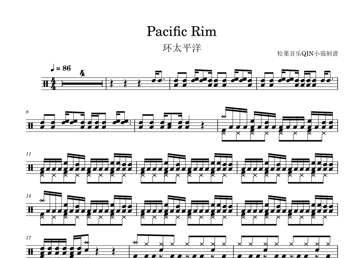 《环太平洋》是环太平洋演唱的一首歌曲,拍号为4/4拍,这份架子鼓谱共有四张高清图谱,图谱由 @松果音乐QIN小强 编配上传,图谱使用五线谱编配,使用这份环太平洋架子鼓谱,你将能够轻松地敲打出这首环太平洋的环太平洋,快来尝试吧。