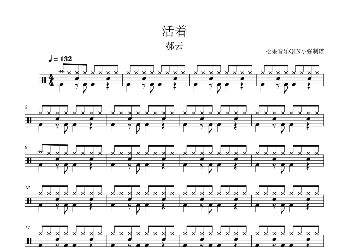 《活着》是郝云演唱的一首歌曲,拍号为4/4拍,这份架子鼓谱共有四张高清图谱,图谱由 @松果音乐QIN小强 编配上传,图谱使用五线谱编配,使用这份活着架子鼓谱,你将能够轻松地敲打出这首郝云的活着,快来尝试吧。《活着》是由郝云填词、谱曲、演唱,于2013年09月12日发行的一首城市民谣歌曲,出自郝云第三张同名专辑《活着》。 郝云凭借这首歌获得2013年MusicRadio中国TOP排行榜最佳创作男歌手,2015年第十四届音乐风云榜年度盛典最佳摇滚艺人提名。