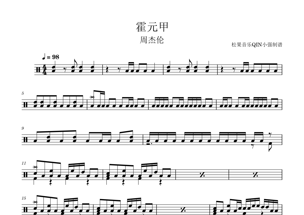 《霍元甲》是周杰伦演唱的一首歌曲,拍号为4/4拍,这份架子鼓谱共有三张高清图谱,图谱由 @松果音乐QIN小强 编配上传,图谱使用五线谱编配,使用这份霍元甲架子鼓谱,你将能够轻松地敲打出这首周杰伦的霍元甲,快来尝试吧。《霍元甲》是周杰伦演唱的一首歌曲,由方文山作词,周杰伦作曲,洪敬尧编曲,收录于周杰伦2006年1月20日发行的同名EP《霍元甲》中 。该曲是电影《霍元甲》的同名主题曲。 2007年,该曲获得第26届香港电影金像奖最佳原创电影歌曲提名,周杰伦凭借该曲获得第18届台湾金曲奖最佳单曲制作人奖 。