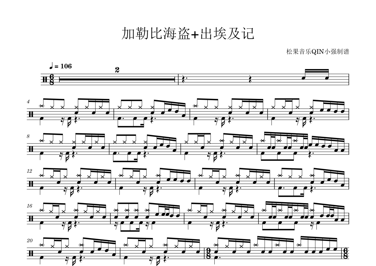 《加勒比海盗》,拍号为4/4拍,这份架子鼓谱共有两张高清图谱,图谱由 @松果音乐QIN小强 编配上传,图谱使用五线谱编配,使用这份加勒比海盗架子鼓谱,你将能够轻松地敲打出这首加勒比海盗,快来尝试吧。