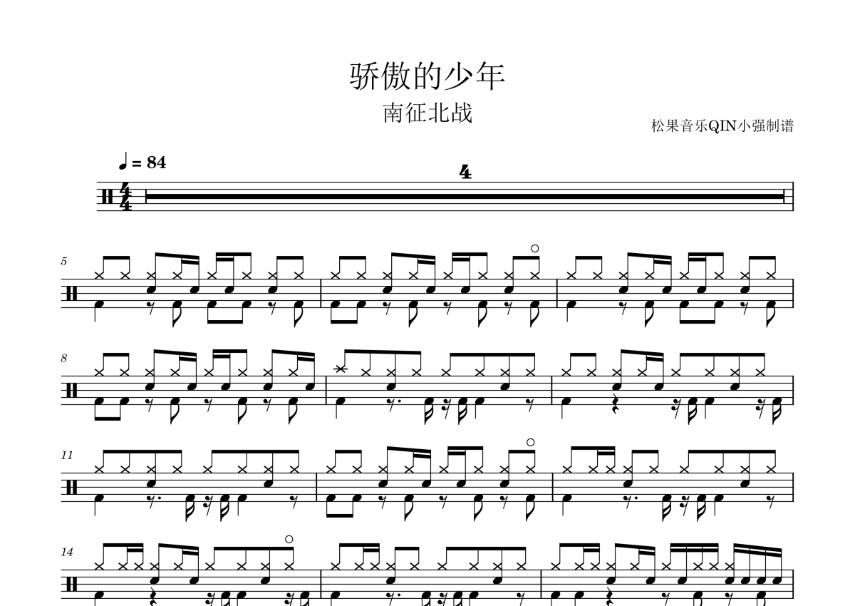 《骄傲的少年》是南征北战演唱的一首歌曲,拍号为4/4拍,这份架子鼓谱共有三张高清图谱,图谱由 @松果音乐QIN小强 编配上传,图谱使用五线谱编配,使用这份骄傲的少年架子鼓谱,你将能够轻松地敲打出这首南征北战的骄傲的少年,快来尝试吧。《骄傲的少年》是由赵辰龙作词,汀洋作曲和编曲,南征北战NZBZ演唱的歌曲。 2015年10月,该作品成为爱国主义网络动画《那年那兔那些事儿》第二季片尾曲。 2016年1月,该作品登上《中国好歌曲》第三季,同时作为2016年中国好歌曲总决赛开场曲展现给大家。