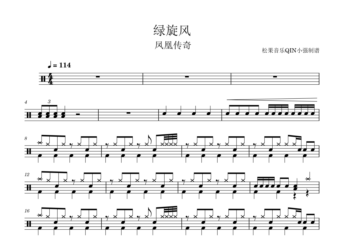 《绿旋风》是凤凰传奇演唱的一首歌曲,拍号为4/4拍,这份架子鼓谱共有三张高清图谱,图谱由 @松果音乐QIN小强 编配上传,图谱使用五线谱编配,使用这份绿旋风架子鼓谱,你将能够轻松地敲打出这首凤凰传奇的绿旋风,快来尝试吧。《绿旋风》是凤凰传奇演唱的歌曲,由屈塬填词,何沐阳谱曲。
