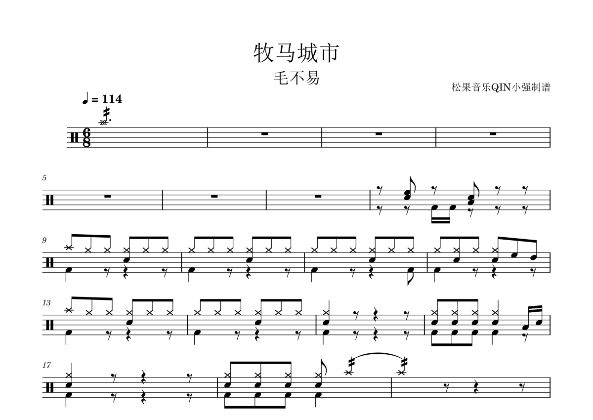 《牧马城市》是毛不易演唱的一首歌曲,拍号为6/8拍,这份架子鼓谱共有四张高清图谱,图谱由 @松果音乐QIN小强 编配上传,图谱使用五线谱编配,使用这份牧马城市架子鼓谱,你将能够轻松地敲打出这首毛不易的牧马城市,快来尝试吧。《牧马城市》是由毛不易演唱的一首歌曲,由谭旋作曲,段思思作词,蔡科俊编曲,收录在2018年3月29日发行的专辑《老男孩 电视剧原声带》中 ,该曲作为电视剧《老男孩》的片尾曲。 2018年12月8日,该曲获得第十二届无线音乐盛典咪咕汇年度十大金曲奖。