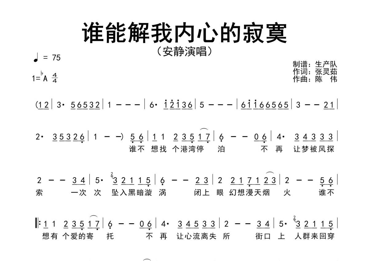 《谁能解我内心的寂寞》是安静演唱的一首歌曲,原版简谱,拍号为4/4拍,歌曲速度为每分钟75拍,这份简谱共有一张高清图谱,图谱由 @生产队 编配上传安静最新演唱的歌曲《谁能解我内心的寂寞》原版简谱,完整的前奏、间奏和solo编配。