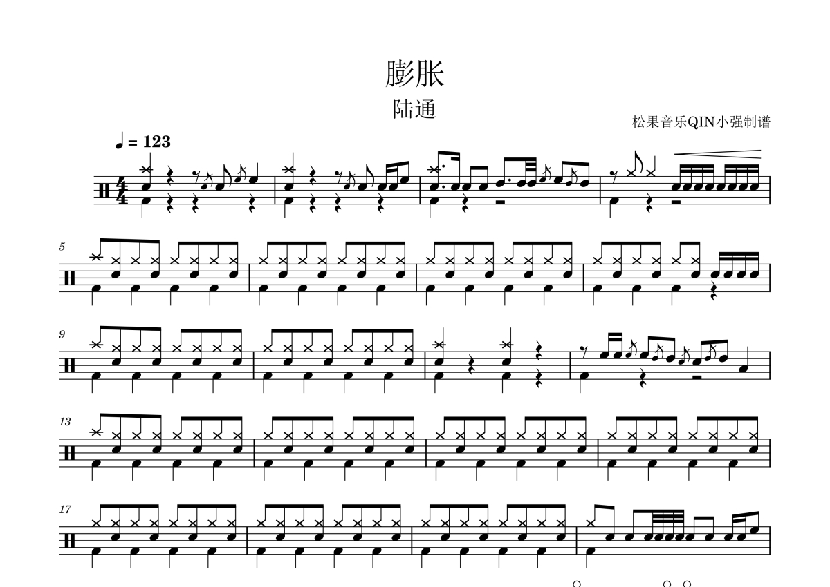 《膨胀》是陆通演唱的一首歌曲,拍号为4/4拍,这份架子鼓谱共有两张高清图谱,图谱由 @松果音乐QIN小强 编配上传,图谱使用五线谱编配,使用这份膨胀架子鼓谱,你将能够轻松地敲打出这首陆通的膨胀,快来尝试吧。《膨胀》是电影《西虹市首富》的插曲,由周品/Akiyama Sayuri填词,Akiyama Sayuri谱曲,陆通演唱。发行于2018年7月26日。