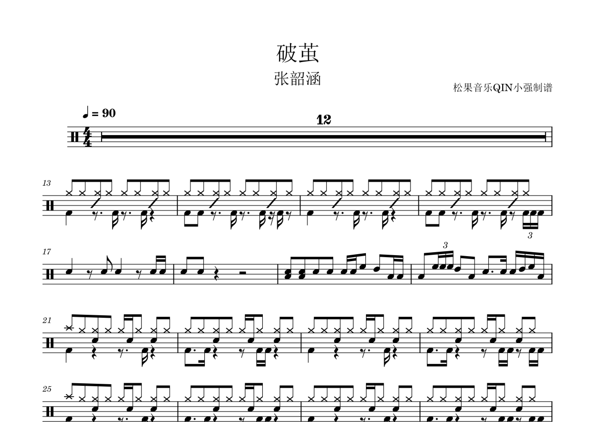 《破茧》是张韶涵演唱的一首歌曲,拍号为4/4拍,这份架子鼓谱共有两张高清图谱,图谱由 @松果音乐QIN小强 编配上传,图谱使用五线谱编配,使用这份破茧架子鼓谱,你将能够轻松地敲打出这首张韶涵的破茧,快来尝试吧。《破茧》是由曹德智、郭德紫毅作词,文颖秋作曲,张韶涵演唱的歌曲,是动画《斗罗大陆》2020年版的主题曲,于2020年5月23日发行 。 2021年1月23日,该曲获得第二届腾讯音乐娱乐盛典年度十大金曲奖。