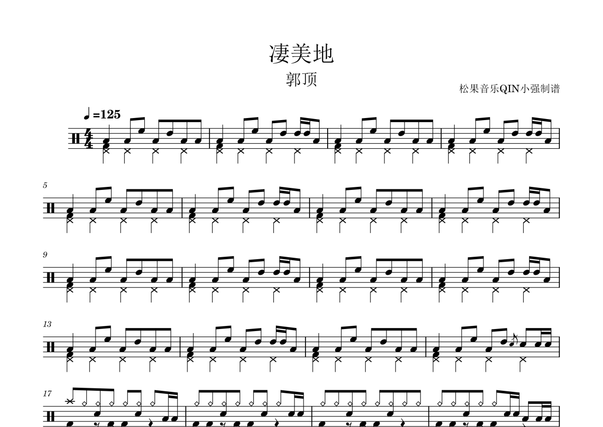 《凄美地》是郭顶演唱的一首歌曲,拍号为4/4拍,这份架子鼓谱共有三张高清图谱,图谱由 @松果音乐QIN小强 编配上传,图谱使用五线谱编配,使用这份凄美地架子鼓谱,你将能够轻松地敲打出这首郭顶的凄美地,快来尝试吧。《凄美地》是郭顶演唱的歌曲,由郭顶完成词曲。该曲收录在专辑《飞行器的执行周期》中,于2016年10月21日通过环球唱片发行 。 2017年5月,郭顶凭借该曲提名第28届台湾金曲奖最佳作曲人奖、最佳作词人奖。