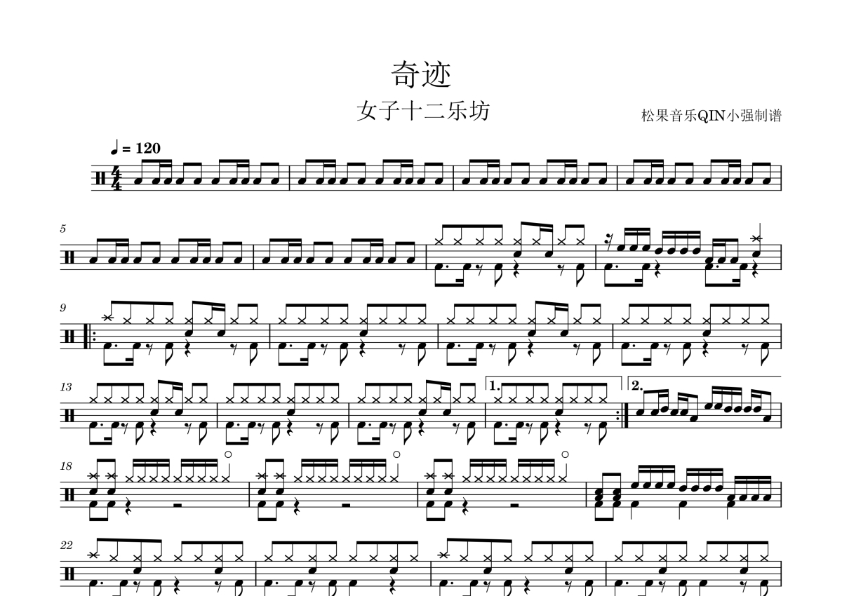《奇迹》是女子十二乐坊演唱的一首歌曲,拍号为4/4拍,这份架子鼓谱共有两张高清图谱,图谱由 @松果音乐QIN小强 编配上传,图谱使用五线谱编配,使用这份奇迹架子鼓谱,你将能够轻松地敲打出这首女子十二乐坊的奇迹,快来尝试吧。《奇迹》是女子十二乐坊推出的音乐专辑。