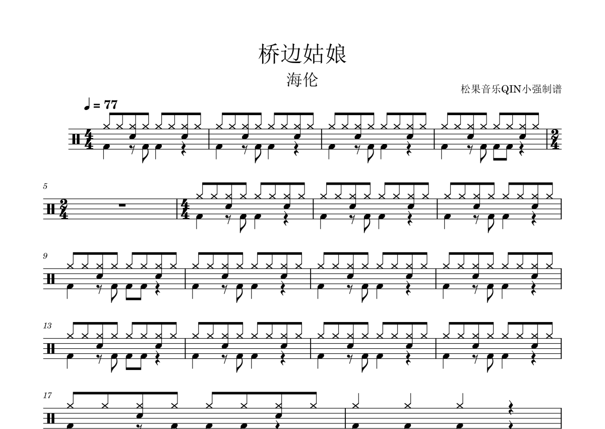 《桥边姑娘》是海伦演唱的一首歌曲,这份架子鼓谱共有两张高清图谱,图谱由 @松果音乐QIN小强 编配上传,图谱使用五线谱编配,使用这份桥边姑娘架子鼓谱,你将能够轻松地敲打出这首海伦的桥边姑娘,快来尝试吧。《桥边姑娘》是由海伦作词、作曲并演唱的歌曲,于2019年11月9日以单曲的形式发行 。 2021年1月23日,该曲获得第二届腾讯音乐娱乐盛典年度十大热歌奖。
