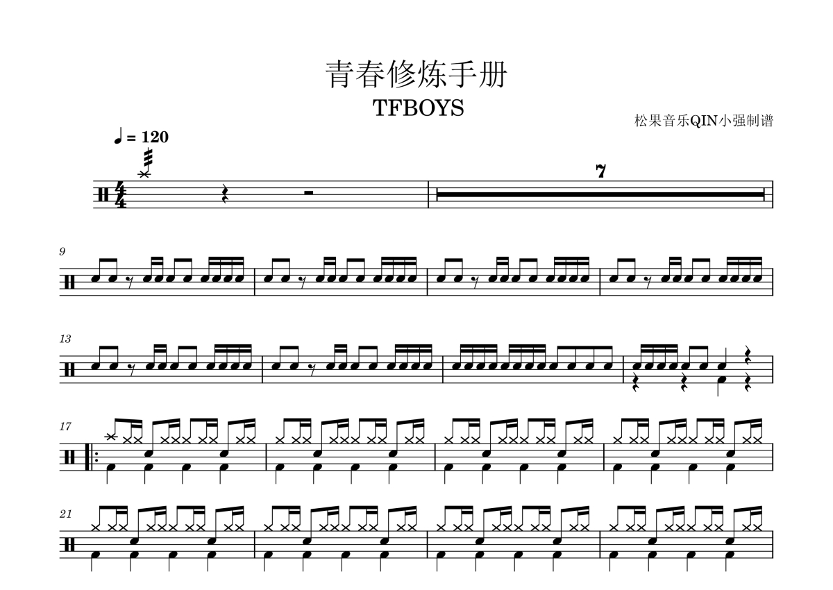 《青春修炼手册》是TFBOYS演唱的一首歌曲,拍号为4/4拍,这份架子鼓谱共有两张高清图谱,图谱由 @松果音乐QIN小强 编配上传,图谱使用五线谱编配,使用这份青春修炼手册架子鼓谱,你将能够轻松地敲打出这首TFBOYS的青春修炼手册,快来尝试吧。《青春修炼手册》是由TFBOYS演唱的歌曲,由王韵韵作词、刘佳谱曲、永之恒乐队等编曲,该歌曲于2014年7月24日正式发行。 2014年12月6日,《青春修炼手册》获得尖叫2015爱奇艺之夜年度金曲奖 。2015年,《青春修炼手册》获得第22届东方风云榜音乐盛典年度十大金曲和2015音乐风云榜年度盛典年度最受欢迎歌曲大奖。