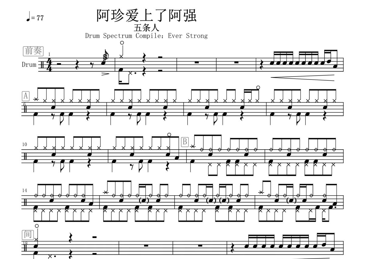 《阿珍爱上了阿强》是五条人演唱的一首歌曲,这份鼓谱共有三张高清图谱,图谱由 @打鼓谱 编配上传,图谱使用五线谱编配,使用这份阿珍爱上了阿强架子鼓谱,你将能够轻松地敲打出这首五条人的阿珍爱上了阿强,快来尝试吧。《阿珍爱上了阿强》是由仁科、茂涛作词作曲,五条人演唱的歌曲。该曲于五条人2016年12月12日发行的专辑《梦幻丽莎发廊》中。五条人乐队,来自广东省汕尾市海丰,中国内地民谣乐队,成立于2008年,由主唱兼吉他茂涛,主唱兼主音吉他、手风琴仁科组成。