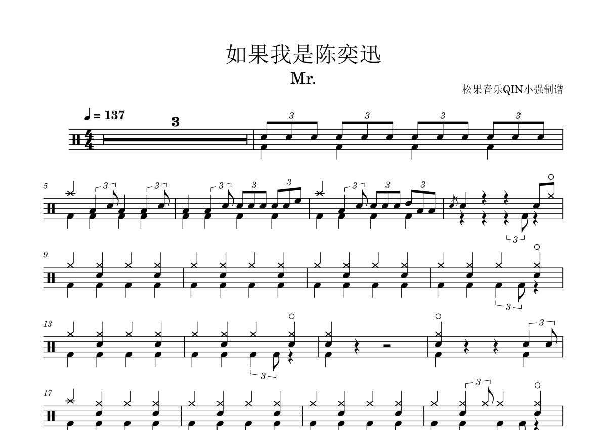 《如果我是陈奕迅》是Mr.演唱的一首歌曲,拍号为4/4拍,这份架子鼓谱共有三张高清图谱,图谱由 @松果音乐QIN小强 编配上传,图谱使用五线谱编配,使用这份如果我是陈奕迅架子鼓谱,你将能够轻松地敲打出这首Mr.的如果我是陈奕迅,快来尝试吧。《如果我是陈奕迅》是由谭健文、小克作词,布志纶作曲,Mr.演唱的歌曲,收录于2009年9月3日发行的专辑《If I Am...》中 ,该歌曲的普通话版版是同名歌曲《如果我是陈奕迅》,收录于2010年2月6日发行的专辑《Like Black》中 。 2009年12月27日,该歌曲获得新城劲爆颁奖礼“新城劲爆歌曲”奖和“新城劲爆播放指数大奖” ;2010年1月1日,该歌曲获得2009年度叱咤乐坛流行榜颁奖典礼“叱咤乐坛我最喜爱的歌曲”奖,Mr.凭借该歌曲获得“叱咤乐坛组合”奖 ;同年1月30日,该歌曲获得第32届十大中文金曲颁奖典礼“十大中文金曲”奖 ;同年9月2日,该歌曲获得2010华语金曲奖“十大华语金曲”奖,并提名“年度最佳粤语歌曲”奖 。