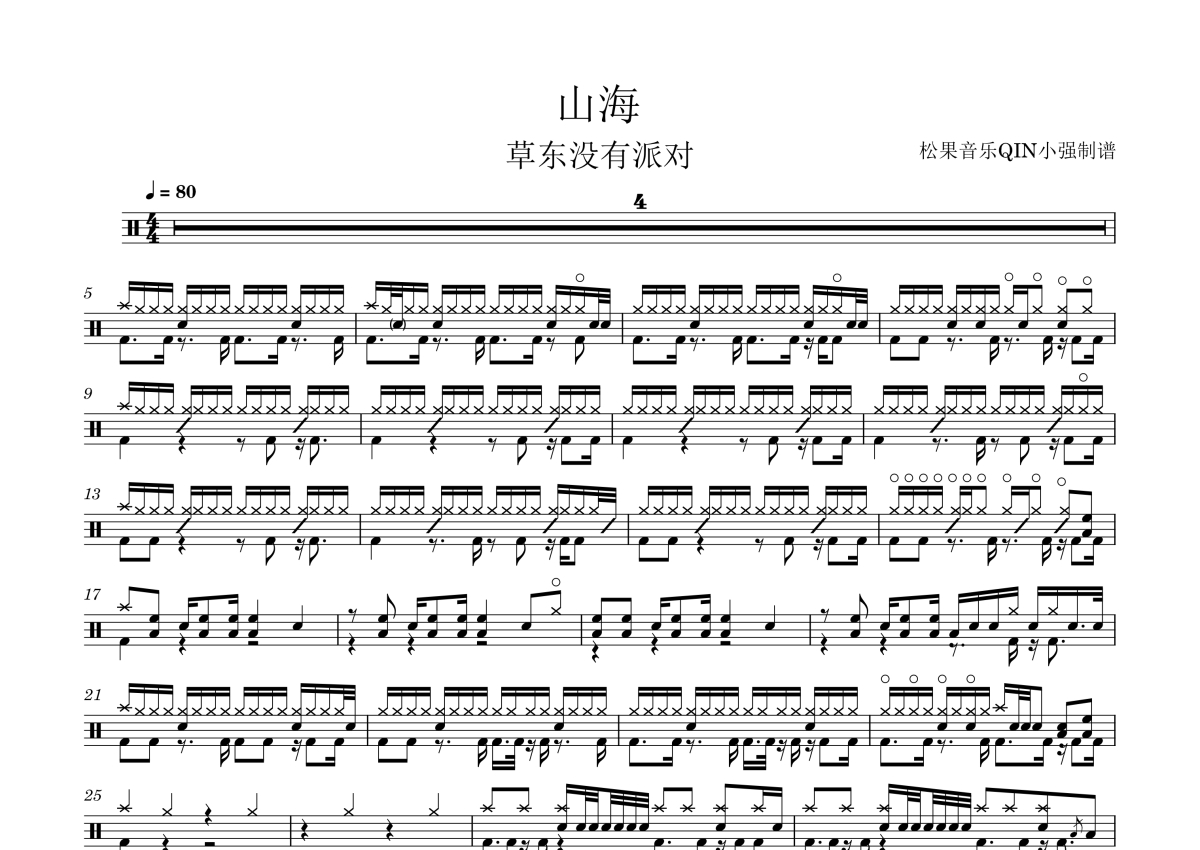 《山海》是草东没有派对演唱的一首歌曲,拍号为4/4拍,这份架子鼓谱共有两张高清图谱,图谱由 @松果音乐QIN小强 编配上传,图谱使用五线谱编配,使用这份山海架子鼓谱,你将能够轻松地敲打出这首草东没有派对的山海,快来尝试吧。《山海》是草东没有派对作词曲并演唱的歌曲,收录在首张专辑《丑奴儿》中。