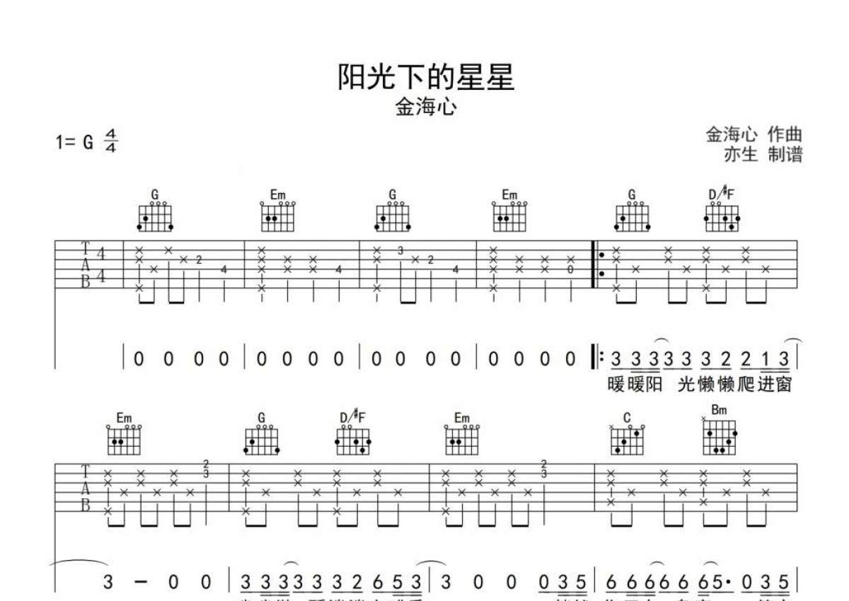 金海心《阳光下的星星》吉他谱 - G调弹唱六线谱