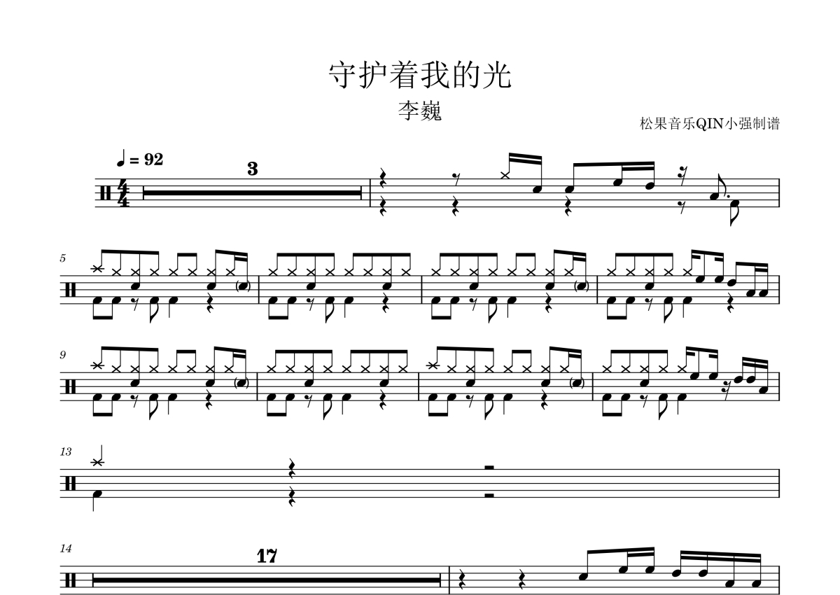 《守护着我的光》是李巍V仔演唱的一首歌曲,拍号为4/4拍,这份架子鼓谱共有三张高清图谱,图谱由 @松果音乐QIN小强 编配上传,图谱使用五线谱编配,使用这份守护着我的光架子鼓谱,你将能够轻松地敲打出这首李巍V仔的守护着我的光,快来尝试吧。《守护着我的光》是由张寥@时光列车TimeExpress作词、作曲,李巍V仔演唱的歌曲,发行于2021年5月18日。 收录于同名专辑《守护着我的光》中。