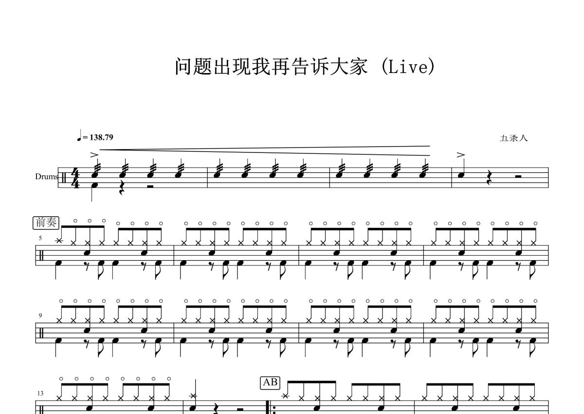 《问题出现我再告诉大家》是五条人演唱的一首歌曲,这份鼓谱共有四张高清图谱,图谱由 @打鼓谱 编配上传,图谱使用五线谱编配,使用这份问题出现我再告诉大家架子鼓谱,你将能够轻松地敲打出这首五条人的问题出现我再告诉大家,快来尝试吧。《问题出现我再告诉大家》是五条人演唱的一首歌曲,收录于2009年7月11日发行的专辑《县城记》中。五条人乐队,来自广东省汕尾市海丰,中国内地民谣乐队,成立于2008年,由主唱兼吉他茂涛,主唱兼主音吉他、手风琴仁科组成。