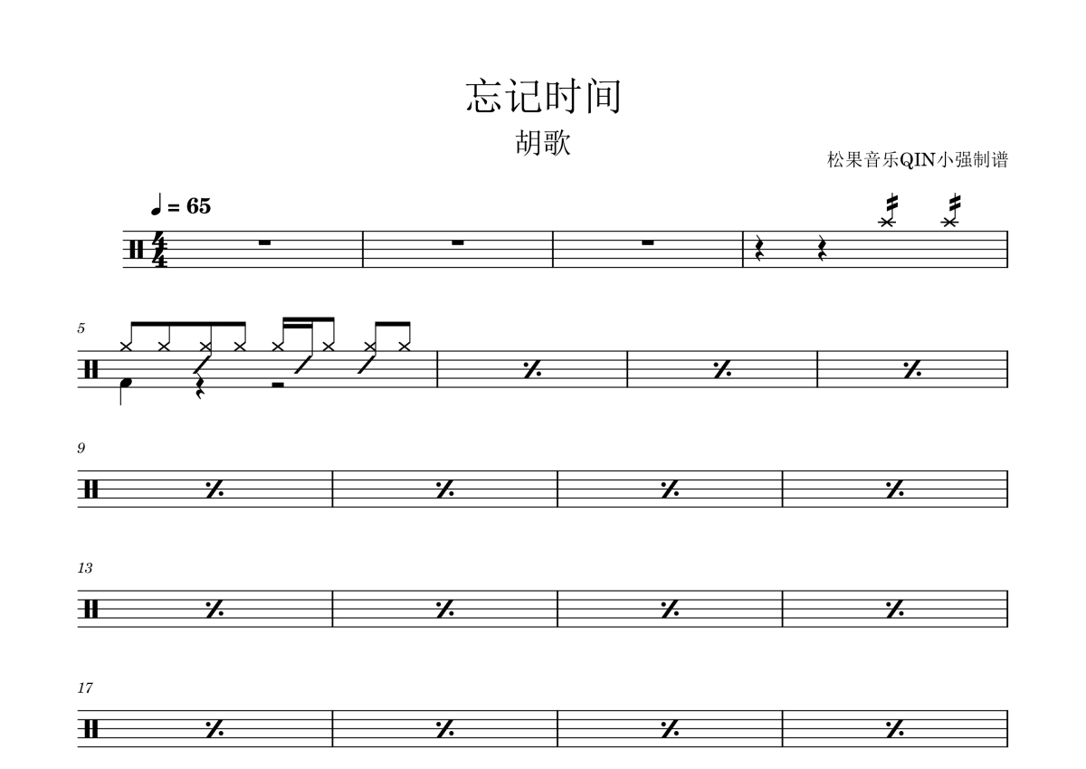 《忘记时间》是胡歌演唱的一首歌曲,拍号为4/4拍,这份架子鼓谱共有两张高清图谱,图谱由 @松果音乐QIN小强 编配上传,图谱使用五线谱编配,使用这份忘记时间架子鼓谱,你将能够轻松地敲打出这首胡歌的忘记时间,快来尝试吧。《忘记时间》是电视剧《仙剑奇侠传三》的片尾曲,由孙艺作词,程振兴作曲,胡歌演唱 ,最早收录在金牌大风2009年6月18日发行的《仙剑奇侠传三 电视剧原声带》中],后收录在胡歌2010年7月2日由金牌大风发行的专辑《蓝光》中。