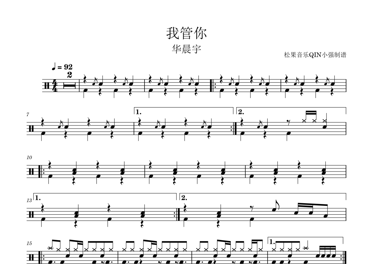 《我管你》是华晨宇演唱的一首歌曲,拍号为4/4拍,这份架子鼓谱共有两张高清图谱,图谱由 @松果音乐QIN小强 编配上传,图谱使用五线谱编配,使用这份我管你架子鼓谱,你将能够轻松地敲打出这首华晨宇的我管你,快来尝试吧。《我管你》是由郭德紫毅作词,华晨宇作曲并演唱的歌曲,收录于华晨宇2015年12月15日发行的专辑《异类》中。该曲于2017年2月27日推出真我版MV。