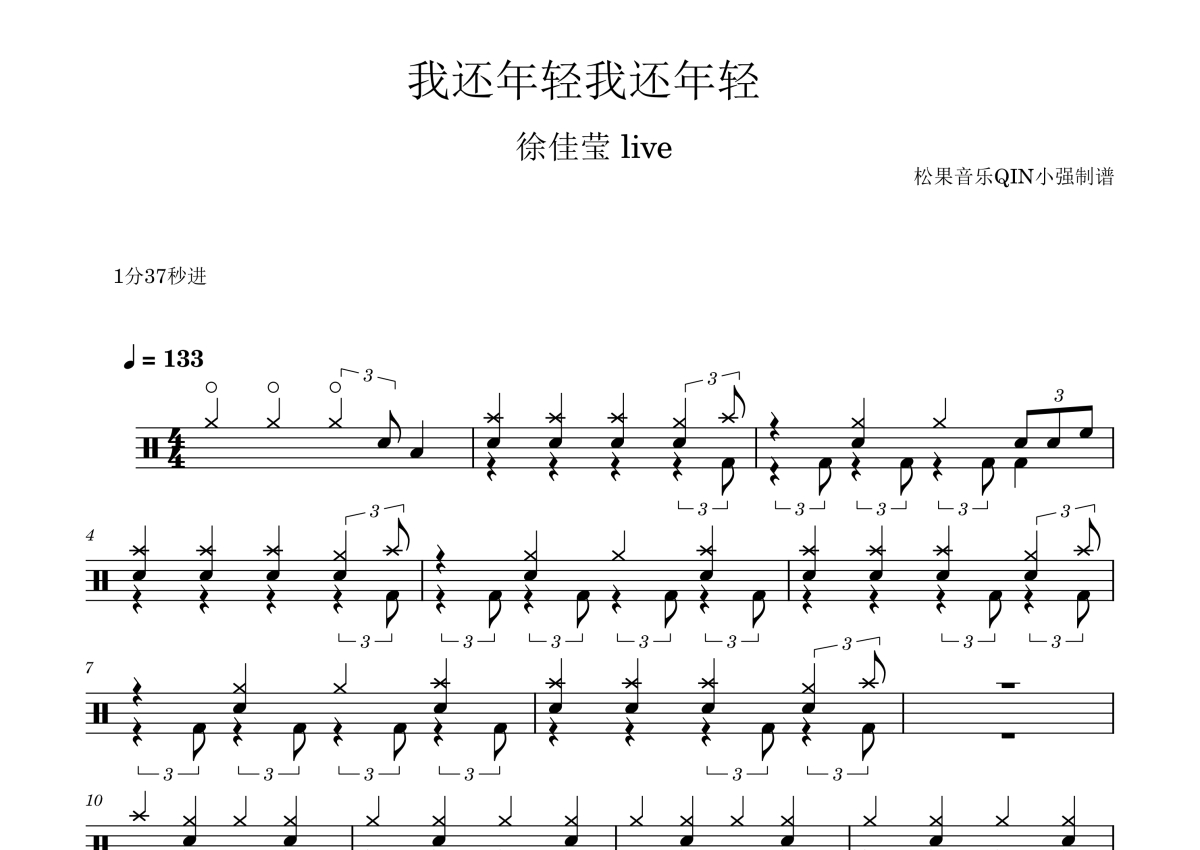 《我还年轻我还年轻》是徐佳莹演唱的一首歌曲,拍号为4/4拍,这份架子鼓谱共有三张高清图谱,图谱由 @松果音乐QIN小强 编配上传,图谱使用五线谱编配,使用这份我还年轻我还年轻架子鼓谱,你将能够轻松地敲打出这首徐佳莹的我还年轻我还年轻,快来尝试吧。
