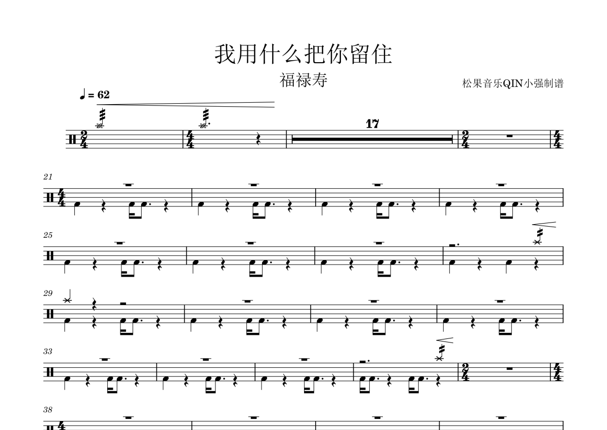 《我用什么把你留住》是福禄寿演唱的一首歌曲,拍号为4/4拍,这份架子鼓谱共有两张高清图谱,图谱由 @松果音乐QIN小强 编配上传,图谱使用五线谱编配,使用这份我用什么把你留住架子鼓谱,你将能够轻松地敲打出这首福禄寿的我用什么把你留住,快来尝试吧。《我用什么把你留住》是福禄寿FloruitShow演唱歌曲,由福禄寿FloruitShow作词、作曲、编曲。收录于福禄寿FloruitShow2018年9月2日发行的同名专辑《我用什么把你留住》中。