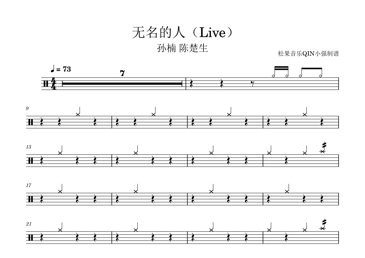 《无名的人》是孙楠/陈楚生演唱的一首歌曲,拍号为4/4拍,这份架子鼓谱共有两张高清图谱,图谱由 @松果音乐QIN小强 编配上传,图谱使用五线谱编配,使用这份无名的人架子鼓谱,你将能够轻松地敲打出这首孙楠/陈楚生的无名的人,快来尝试吧。《无名的人》是孙楠 陈楚生演唱的歌曲,唐恬作词,钱雷作曲,张亦江担任制作人,发行于2024年3月18日,收录于同名专辑《无名的人》中。