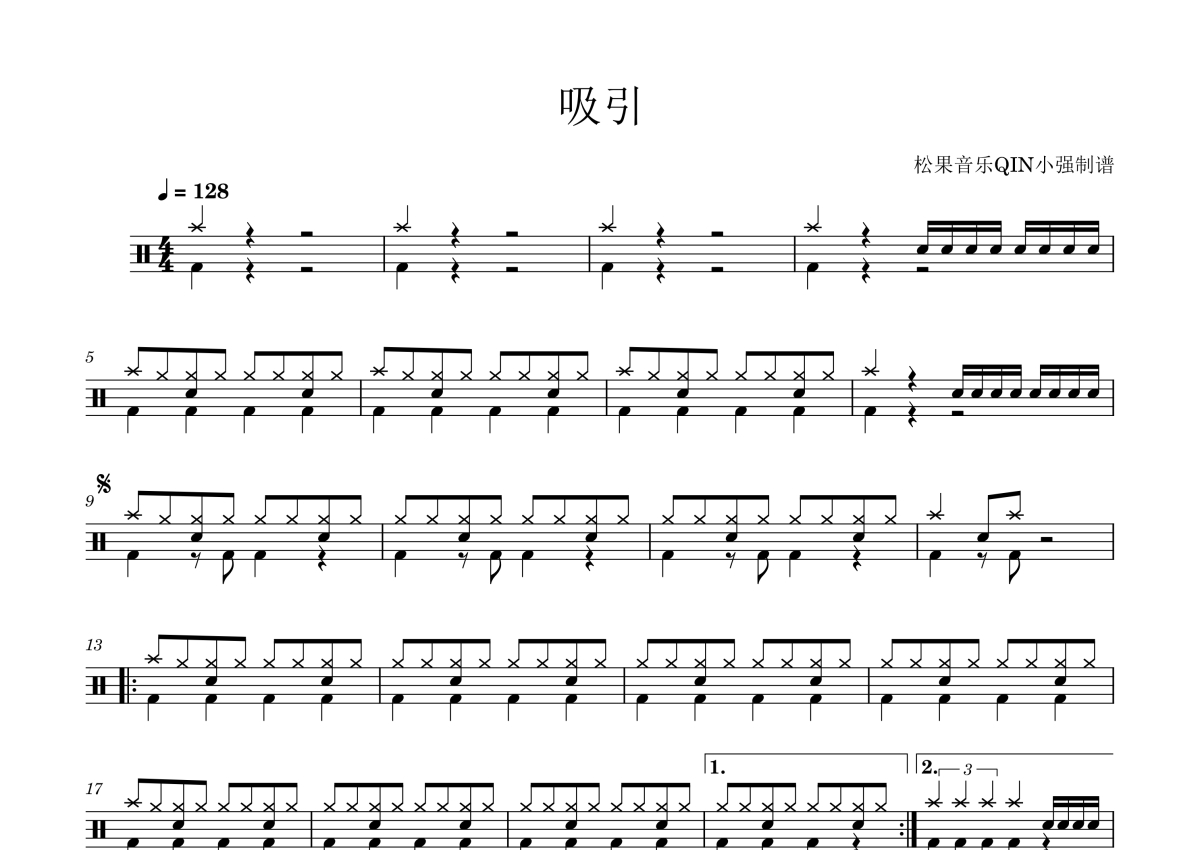 《吸引》是天下足球主题曲演唱的一首歌曲,拍号为4/4拍,这份架子鼓谱共有一张高清图谱,图谱由 @松果音乐QIN小强 编配上传,图谱使用五线谱编配,使用这份吸引架子鼓谱,你将能够轻松地敲打出这首天下足球主题曲的吸引,快来尝试吧。吸引。