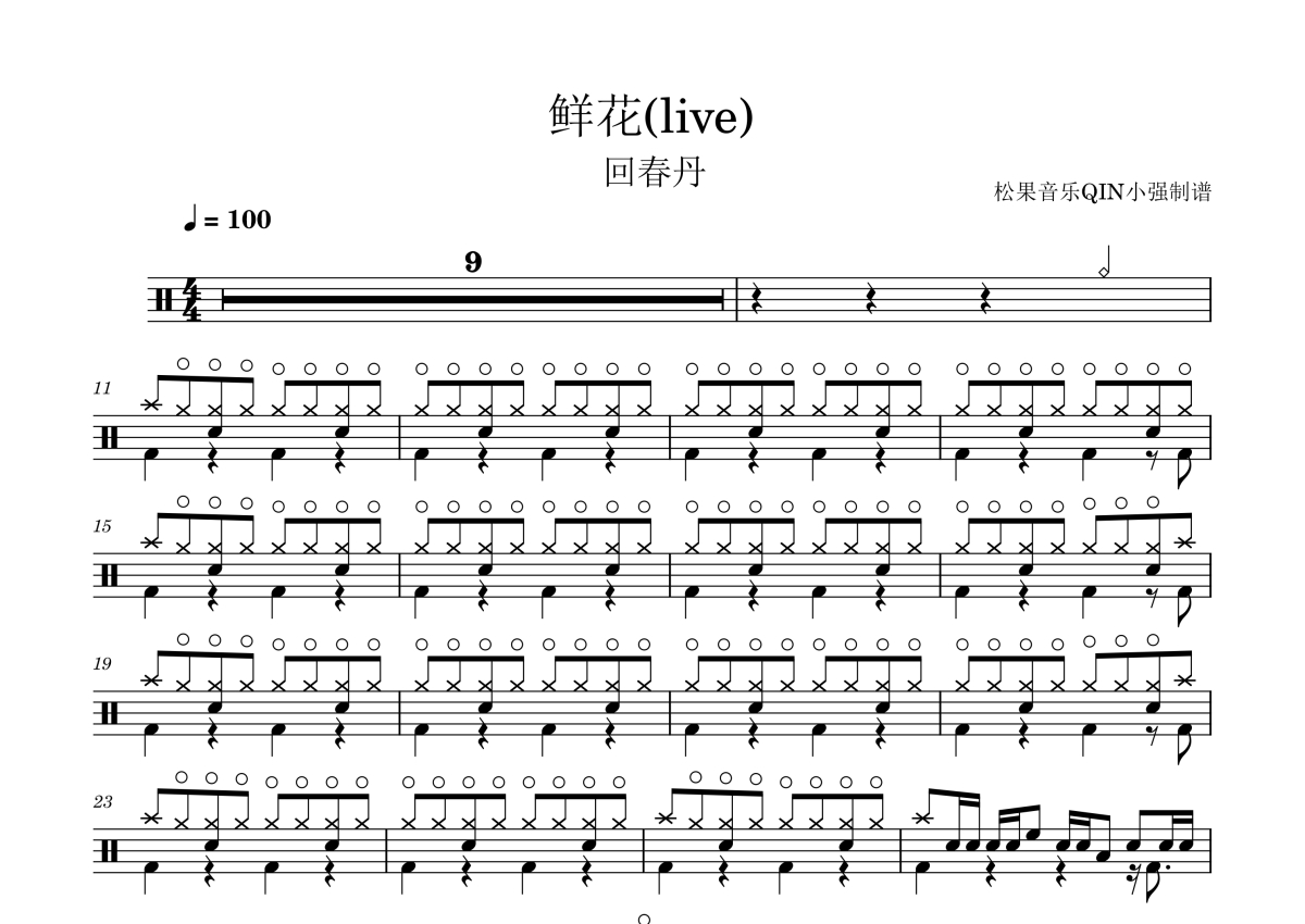 《鲜花(live)》是live演唱的一首歌曲,拍号为4/4拍,这份架子鼓谱共有五张高清图谱,图谱由 @松果音乐QIN小强 编配上传,图谱使用五线谱编配,使用这份鲜花(live)架子鼓谱,你将能够轻松地敲打出这首live的鲜花(live),快来尝试吧。《鲜花》是回春丹演唱的歌曲。