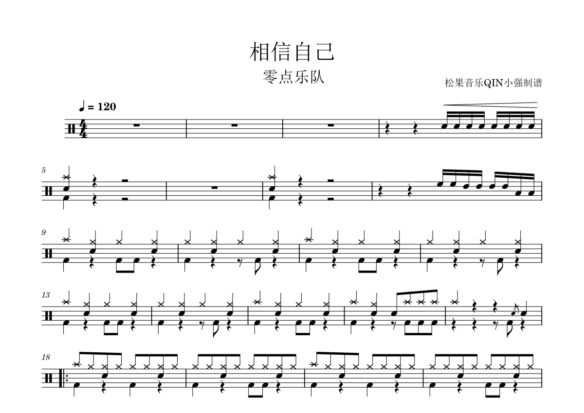 《相信自己》是零点乐队演唱的一首歌曲,拍号为4/4拍,这份架子鼓谱共有两张高清图谱,图谱由 @松果音乐QIN小强 编配上传,图谱使用五线谱编配,使用这份相信自己架子鼓谱,你将能够轻松地敲打出这首零点乐队的相信自己,快来尝试吧。《相信自己》是由零点乐队作词、作曲并演唱的歌曲,发行于2000年12月 ,后收录于零点乐队2002年发行的专辑《没有什么不可以》中 。 2001年3月23日,该曲获得了第8届中国歌曲排行榜公益歌曲特别奖 。2003年9月28日,该曲获得2002 Music IN中国流行歌曲榜内地十大金曲。