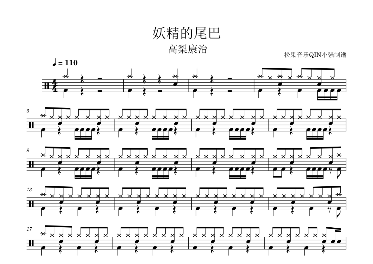 《妖精尾巴》是高梨康治演唱的一首歌曲,拍号为4/4拍,这份架子鼓谱共有两张高清图谱,图谱由 @松果音乐QIN小强 编配上传,图谱使用五线谱编配,使用这份妖精尾巴架子鼓谱,你将能够轻松地敲打出这首高梨康治的妖精尾巴,快来尝试吧。