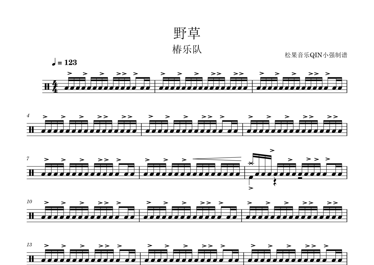《野草》是椿乐队演唱的一首歌曲,拍号为4/4拍,这份架子鼓谱共有四张高清图谱,图谱由 @松果音乐QIN小强 编配上传,图谱使用五线谱编配,使用这份野草架子鼓谱,你将能够轻松地敲打出这首椿乐队的野草,快来尝试吧。