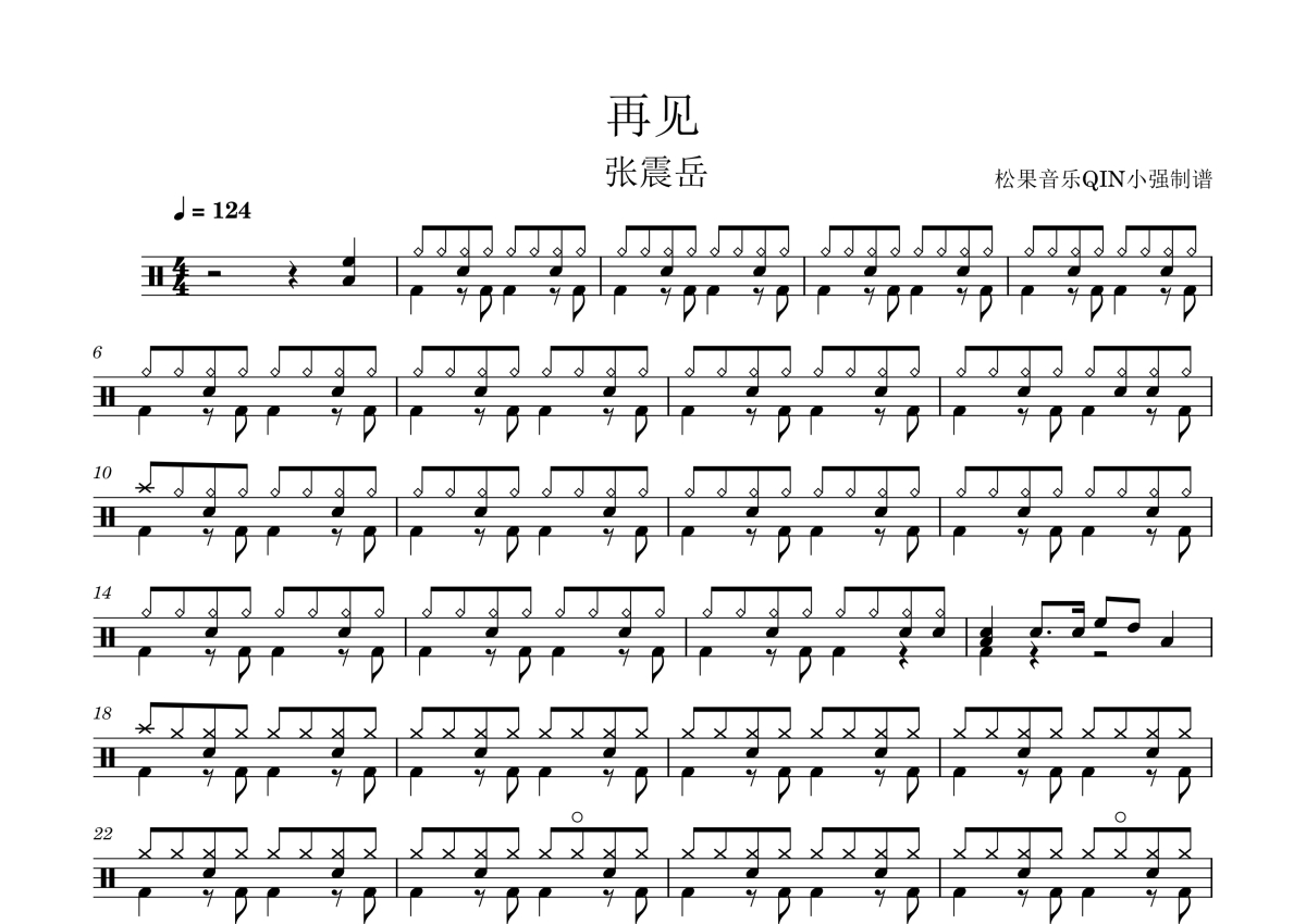 《再见》是张震岳演唱的一首歌曲,拍号为4/4拍,这份架子鼓谱共有两张高清图谱,图谱由 @松果音乐QIN小强 编配上传,图谱使用五线谱编配,使用这份再见架子鼓谱,你将能够轻松地敲打出这首张震岳的再见,快来尝试吧。《再见》是由张震岳作词、作曲、编曲并演唱的歌曲于2005年7月8日以EP单曲形式发行,后收录在张震岳2007年7月6日由滚石唱片发行的音乐专辑《OK》中 。 2010年12月,该曲入选LOVE RADIO“新世纪十年十大华语情歌”20强。