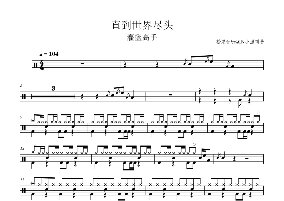 《直到世界尽头》是WANDS演唱的一首歌曲,拍号为4/4拍,这份架子鼓谱共有三张高清图谱,图谱由 @松果音乐QIN小强 编配上传,图谱使用五线谱编配,使用这份直到世界尽头架子鼓谱,你将能够轻松地敲打出这首WANDS的直到世界尽头,快来尝试吧。《直到世界终结(世界が终るまでは…)》是日本摇滚乐队WANDS的一支单曲,由上杉升作词,织田哲郎作曲,叶山たけし编曲。也是日本朝日电视台动画《灌篮高手》第二期(25-49集)的片尾曲。该歌曲发行于1994年6月8日,歌曲的MV在东京羽田机场的一个库房中拍摄。该歌曲后被收入WANDS的第四张专辑《PIECE OF MY SOUL》(1995年)中。