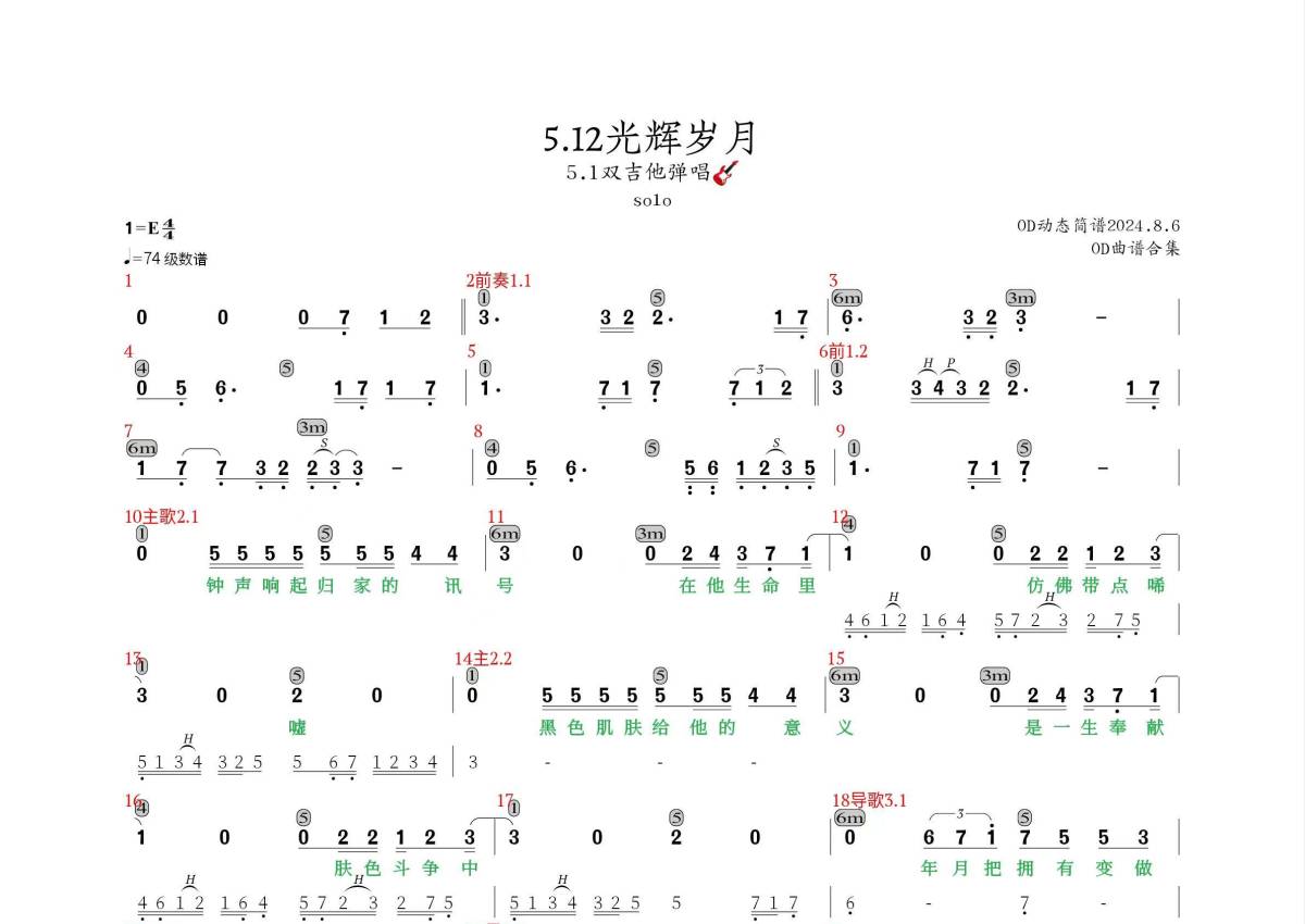 《光辉岁月》是Beyond演唱的一首歌曲,双吉他版,拍号为4/4拍,歌曲速度为每分钟74拍,歌曲原调为E调,这份简谱共有三张高清图谱,图谱由 @OD乐器行₁₅₂⁰⁵⁹¹₀₅₉₅ 编配上传。