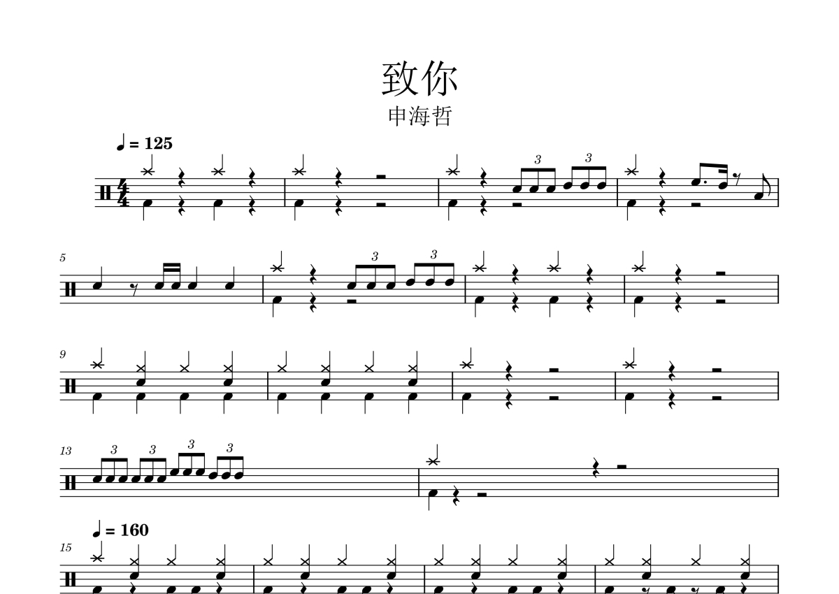 《致你》是致你演唱的一首歌曲,拍号为4/4拍,这份架子鼓谱共有三张高清图谱,图谱由 @松果音乐QIN小强 编配上传,图谱使用五线谱编配,使用这份致你架子鼓谱,你将能够轻松地敲打出这首致你的致你,快来尝试吧。《致你》是韩国电视剧《请回答1998》的片头曲 原唱韩国歌手徐太志和孩子们,翻唱是韩国歌手成时京。