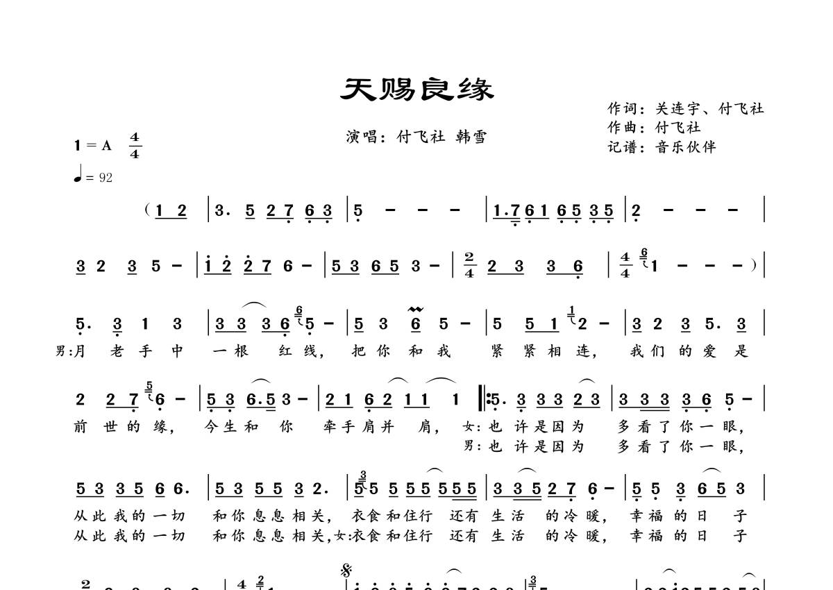 《天赐良缘》是付飞社 韩雪演唱的一首歌曲,拍号为4/4拍,歌曲速度为每分钟92拍,这份简谱共有一张高清图谱,图谱由 @音乐伙伴 编配上传。
