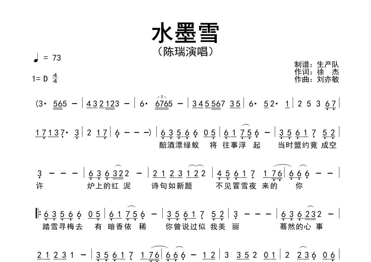 《水墨雪》是陈瑞演唱的一首歌曲,原版简谱,拍号为4/4拍,歌曲速度为每分钟73拍,这份简谱共有一张高清图谱,图谱由 @生产队 编配上传陈瑞演唱的歌曲《水墨雪》原版简谱,完整的前奏、间奏、尾奏和solo编配。