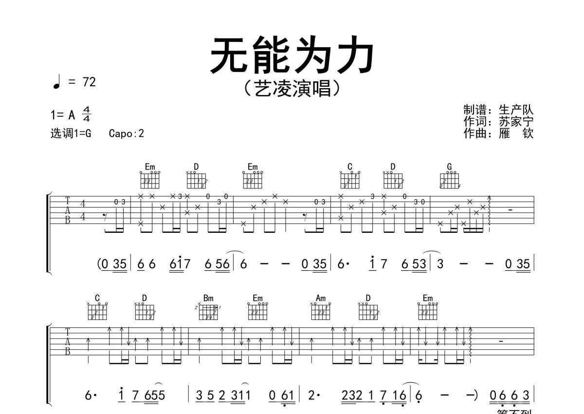 《无能为力》是艺凌演唱的一首歌曲,精编完美版,拍号为4/4拍,歌曲速度为每分钟72拍,歌曲原调为A调,但由于原调指法比较难,为了方便弹奏,本吉他谱采用的是G调指法编配,变调夹2品弹奏即为原调,当然也可以根据自己的音域改变变调夹位置,或者通过改变和弦调性,以方便自己弹奏,这份吉他谱共有三张高清图谱,图谱由 @生产队 编配上传,图谱使用六线谱编配,包含吉他和弦指法、简谱以及歌词部分,使用这份无能为力吉他谱,可以让你更加方便地掌握这首歌曲的弹唱技巧,快来尝试吧。《无能为力》是由歌手艺凌演唱的歌曲。本吉他谱根据原版G调指法编配,完整的前奏、间奏、尾奏和solo编配,精编完美版,一首触动心灵的歌曲,值得推荐。如果和你相遇只是个奇迹,我愿一直等你几个世纪,这一段情缘是否会有结局,每分每秒我都会去珍惜。