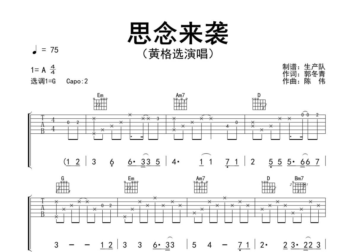 《思念来袭》是黄格选演唱的一首歌曲,精编完美版,拍号为4/4拍,歌曲速度为每分钟75拍,歌曲原调为A调,但由于原调指法比较难,为了方便弹奏,本吉他谱采用的是G调指法编配,变调夹2品弹奏即为原调,当然也可以根据自己的音域改变变调夹位置,或者通过改变和弦调性,以方便自己弹奏,这份吉他谱共有三张高清图谱,图谱由 @生产队 编配上传,图谱使用六线谱编配,包含吉他和弦指法、简谱以及歌词部分,使用这份思念来袭吉他谱,可以让你更加方便地掌握这首歌曲的弹唱技巧,快来尝试吧。《思念来袭》是歌手黄格选最新推出的单曲。本吉他谱根据原版G调指法编配,完整的前奏、间奏和solo编配,精编完美版,值得推荐的一首抒情歌曲。后来总怕夜雨哭泣,又是一场思念来袭,想你的时候却不敢联系,只好梦中为难我自己。