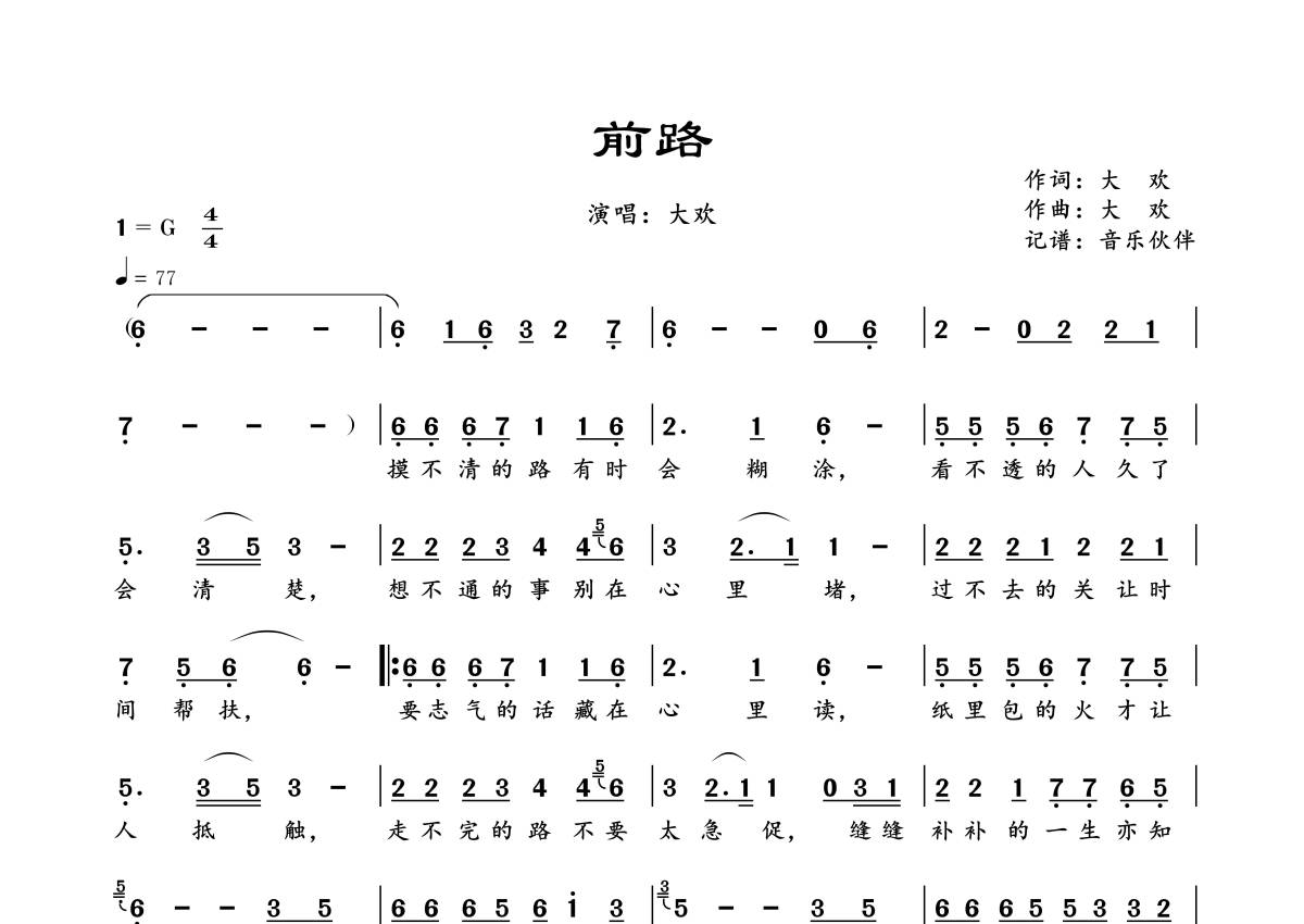 《前路》是大欢演唱的一首歌曲,拍号为4/4拍,歌曲速度为每分钟77拍,这份简谱共有一张高清图谱,图谱由 @音乐伙伴 编配上传。