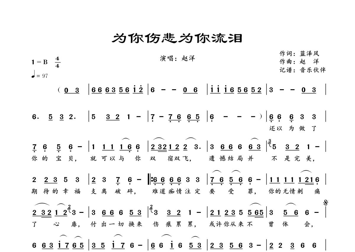 《为你伤悲为你流泪》是赵洋演唱的一首歌曲,拍号为4/4拍,歌曲速度为每分钟97拍,这份简谱共有一张高清图谱,图谱由 @音乐伙伴 编配上传。