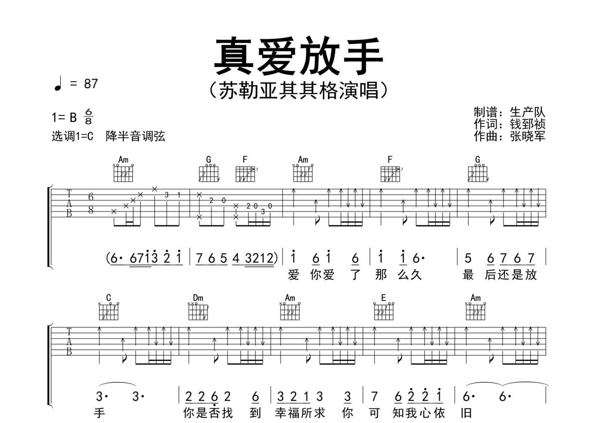 《真爱放手》是苏勒亚其其格演唱的一首歌曲,精编完美版,拍号为6/8拍,歌曲速度为每分钟87拍,歌曲原调为B调,但由于原调指法比较难,为了方便弹奏,本吉他谱采用的是C调指法编配,降半音调弦弹奏即为原调,当然也可以根据自己的音域决定是否调弦,这份吉他谱共有三张高清图谱,图谱由 @生产队 编配上传,图谱使用六线谱编配,包含吉他和弦指法、简谱以及歌词部分,使用这份真爱放手吉他谱,可以让你更加方便地掌握这首歌曲的弹唱技巧,快来尝试吧。《真爱放手》是由歌手苏勒亚其其格演唱的歌曲。本吉他谱根据原版C调指法编配,完整的前奏、间奏、尾奏和solo编配,精编版,值得推荐的一首抒情歌曲。爱你爱了那么久,最后还是放手,想你的时候孤星伴月,那是你亮丽双眸。