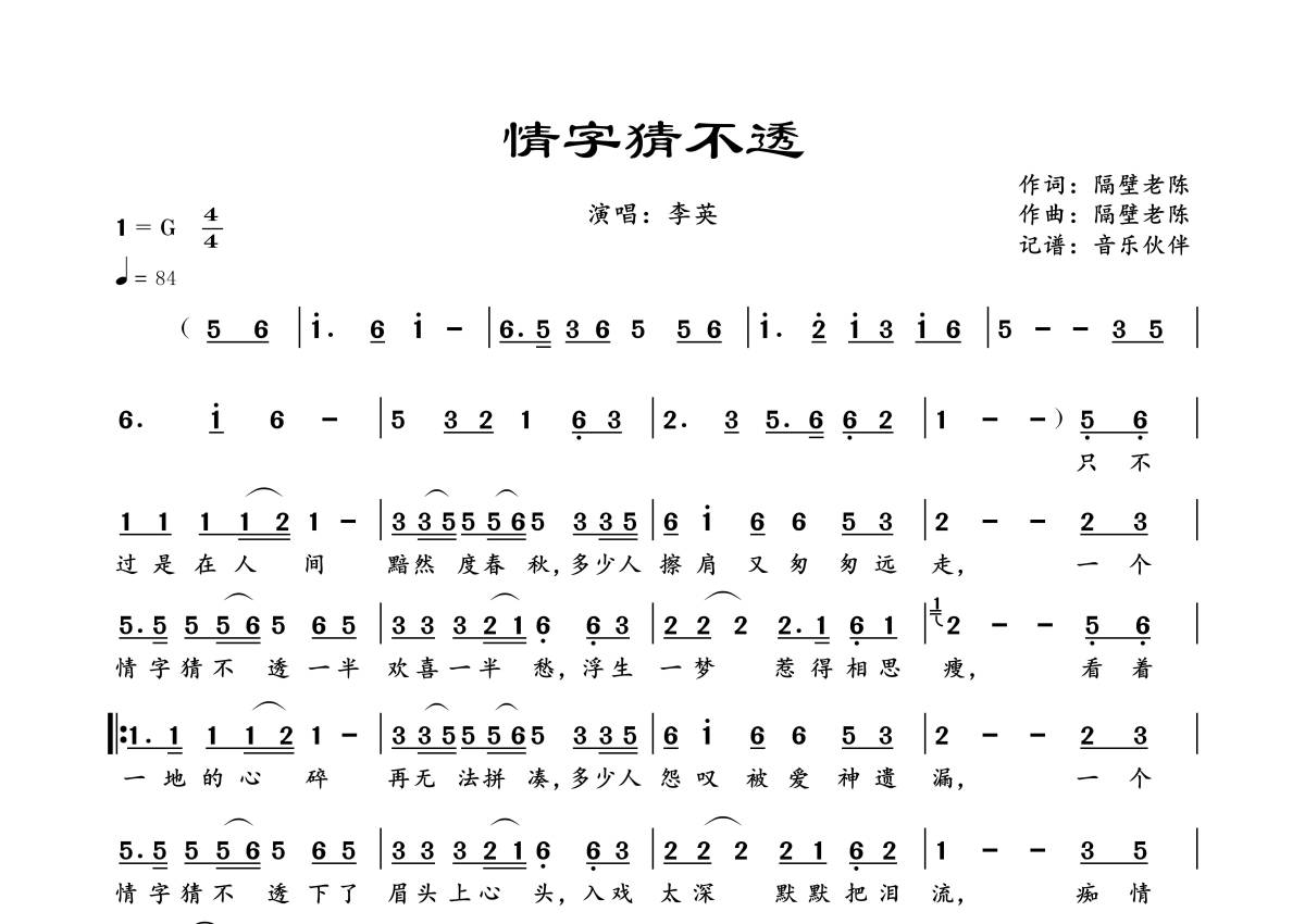 《情字猜不透》是李英演唱的一首歌曲,拍号为4/4拍,歌曲速度为每分钟84拍,这份简谱共有一张高清图谱,图谱由 @音乐伙伴 编配上传。