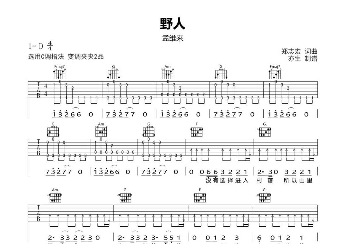孟维来《野人》吉他谱 - C调弹唱六线谱
