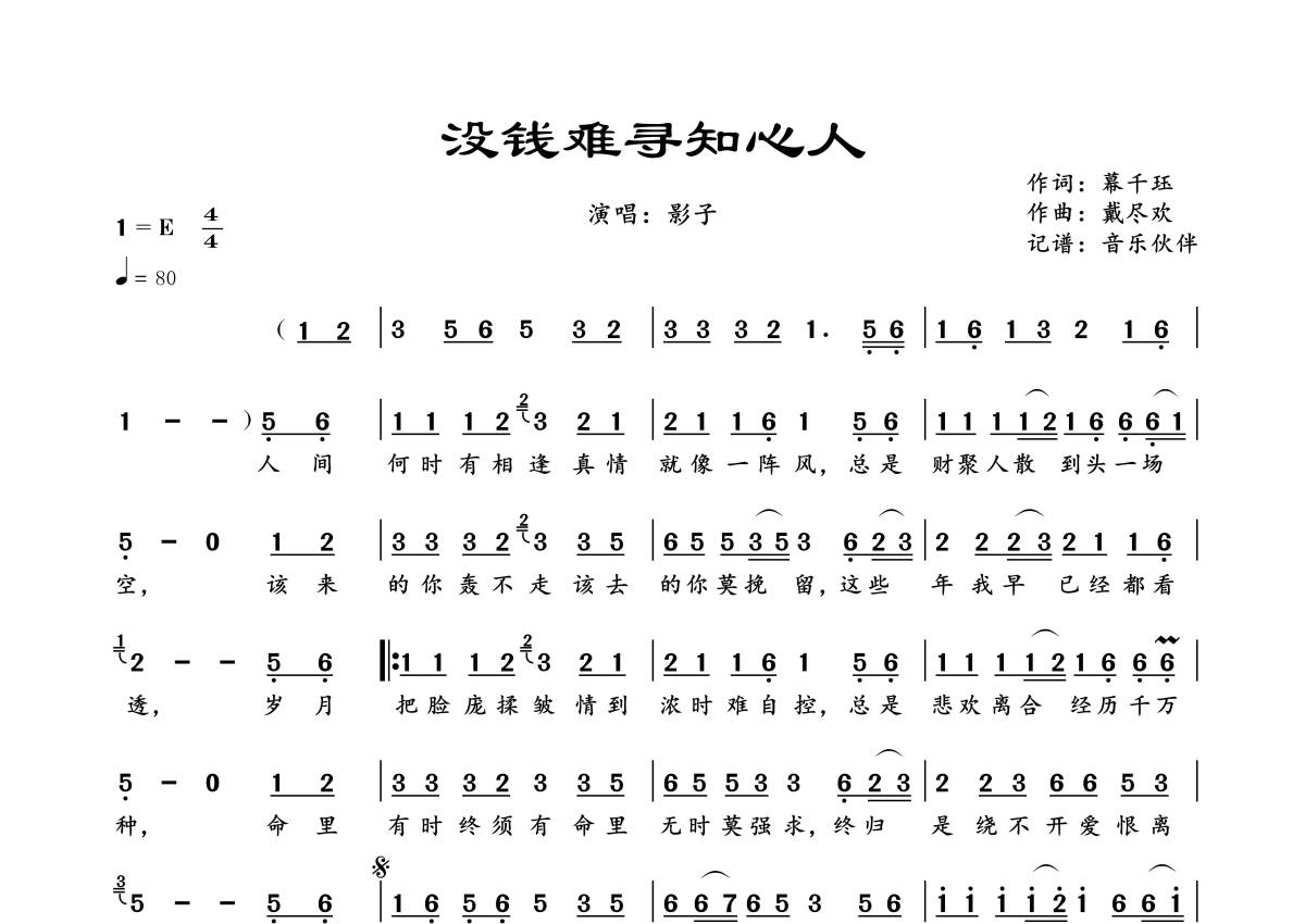 《没钱难寻知心人》是影子演唱的一首歌曲,拍号为4/4拍,歌曲速度为每分钟80拍,这份简谱共有一张高清图谱,图谱由 @音乐伙伴 编配上传。